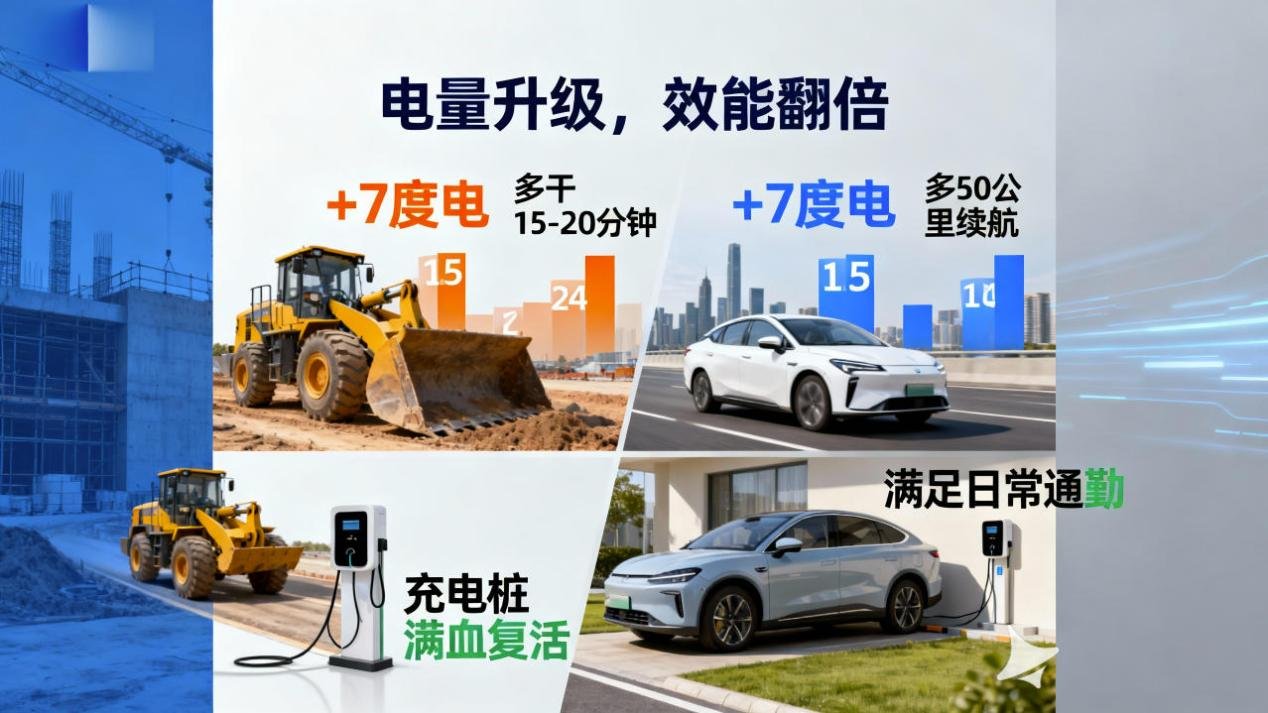 對(duì)主流電動(dòng)汽車而言,每度電約可支持5–8公里的續(xù)航;增加7度電,意味著額外獲得35–56公里的行駛里程,相當(dāng)于從容應(yīng)對(duì)從市中心到郊區(qū)的通勤距離。而在電動(dòng)裝載機(jī)上,這多儲(chǔ)備的7度電,則代表每次充滿電后可多工作15–20分鐘——日積月累,其經(jīng)濟(jì)價(jià)值不容小覷。尤其在野外作業(yè)中突遇電量告急,這7度電,足以讓設(shè)備開到充電站“滿血復(fù)活”,持續(xù)奮戰(zhàn)。